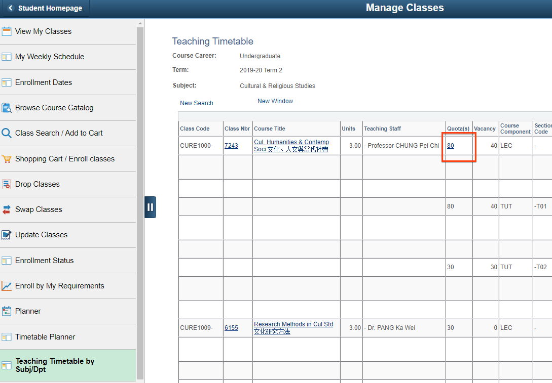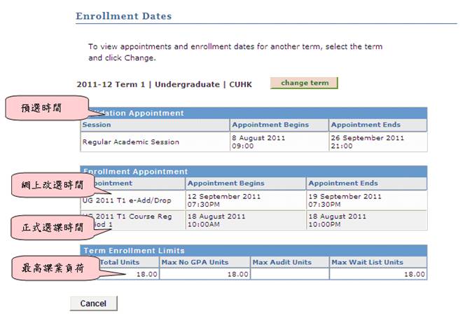 以上各項資料可於CUSIS系統內查閱:按「Manage Classes」後再選取「Enrollment Dates」。