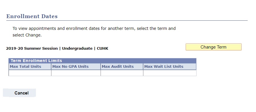 學生全年修讀之學分如已達學則規定之最高課業負荷,則不能修讀暑期課程,其「Term Enrolment Limits」將會為顯示空白。
