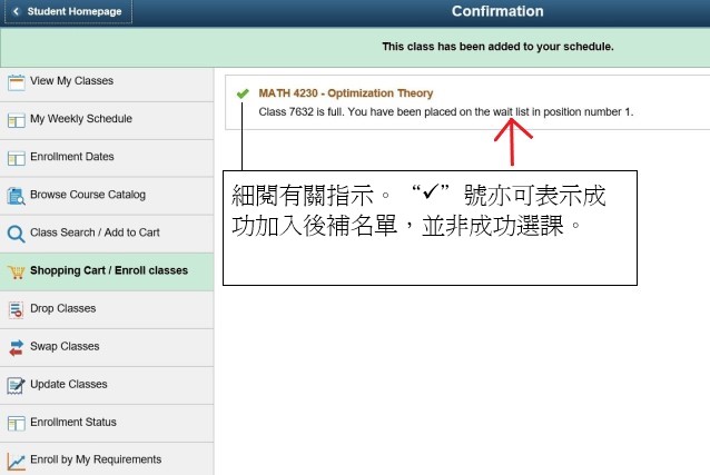 請注意,在Status指示“✔”並不代表加選或退科成功。學生在查閱選課結果時,必須細閱有關提示(message),請參閱以下圖示: