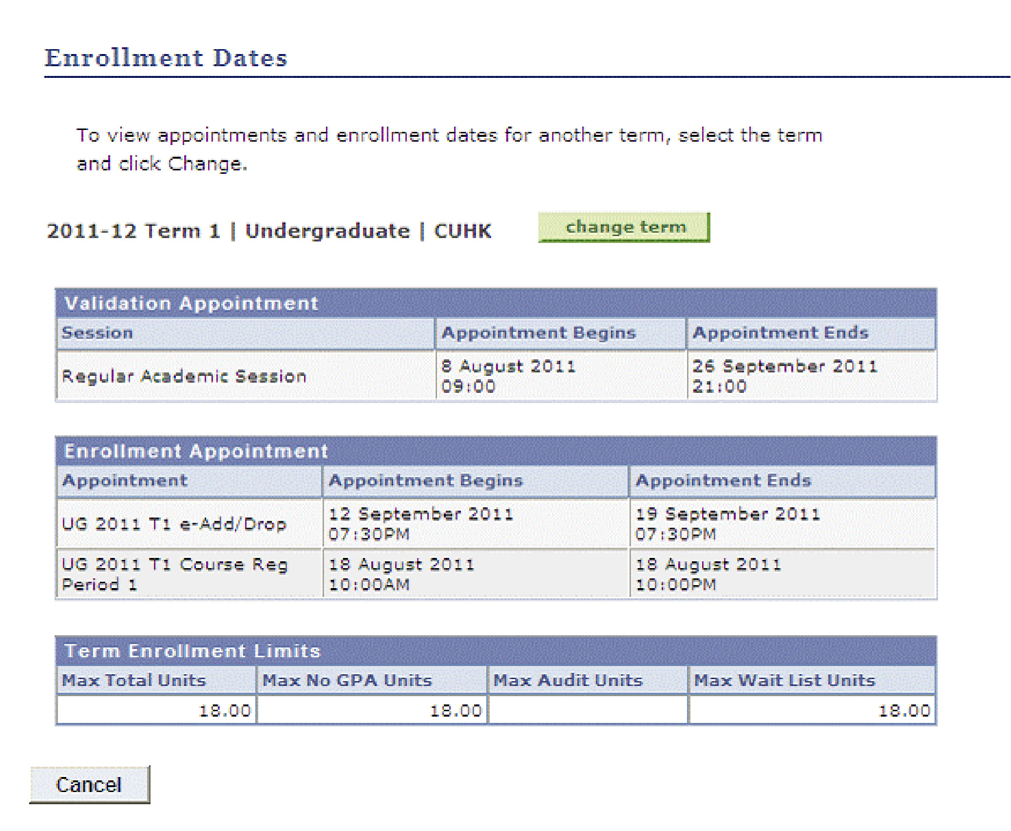 Yes, the units of the courses on waitlist will not be counted into the maximum course load of the students. However, CUSIS will check students’ maximum course load before enrolling them into the class from waitlist, e.g. a student has already registered 16 units, system will not enroll him/her from the waitlist of a 3-unit course as the course load of the student will exceed the maximum (18 units), even if the course has quota available and the student is in position 1 of the waitlist.